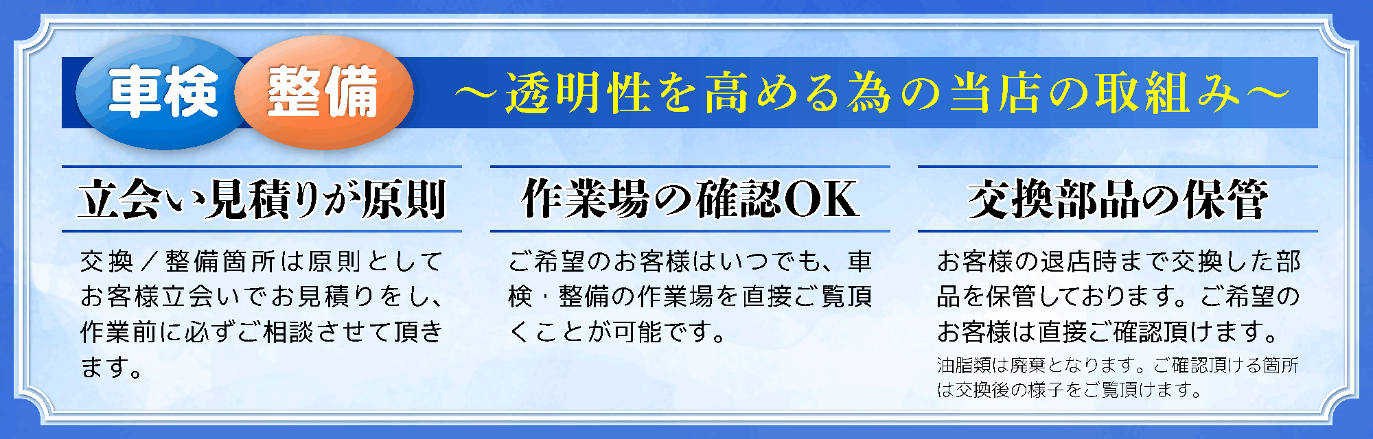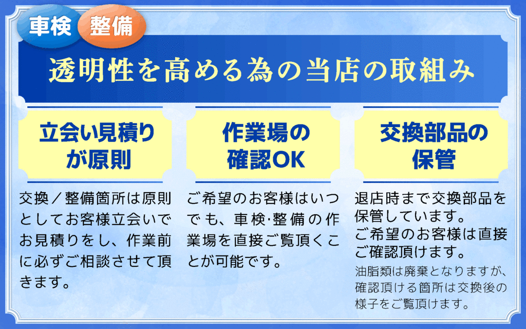 ②カーディーラーと違い、車を販売する為の営業マンの人件費や折込みチラシ等の費用がかかっていない為、その費用分を安く、八戸市・三沢市・十和田市・上北郡おいらせ町・六戸町・三戸郡南部町・階上町・五戸町エリアのお客様に車検をご提供!